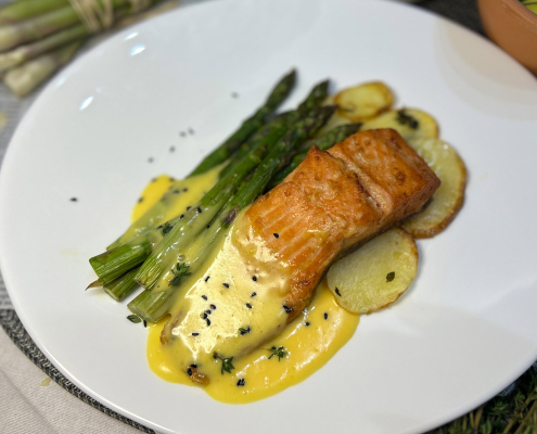 Вкусна сьомга с аспержи, хрупкав картофен чипс и богат, кремообразен сос Холандез – перфектна комбинация от вкусове, която ще ви накара да искате още.