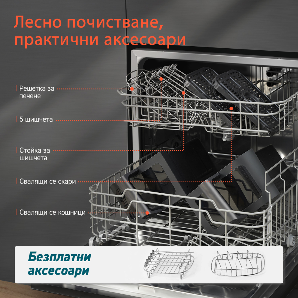 Усъвършенствайте готвенето си с включените аксесоари подарък – удобна стойка за шишчета с пет шишчета и решетка за препичане на хляб.