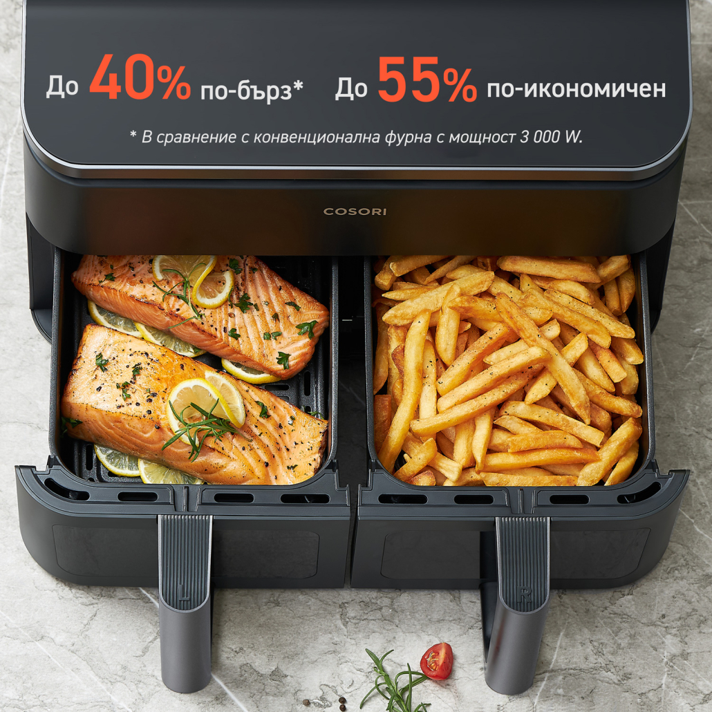 Cosori Dual Basket е създаден в Калифорния, а Cosori e бранд номер едно по продажби в САЩ и носител на редица престижни награди.