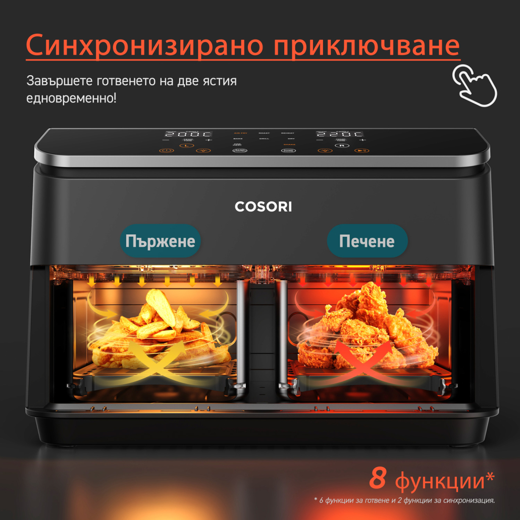 - Синхронизирано готвене: Използвайте едни и същи настройки за двете кошници, за да удвоите бързо количеството приготвена храна.